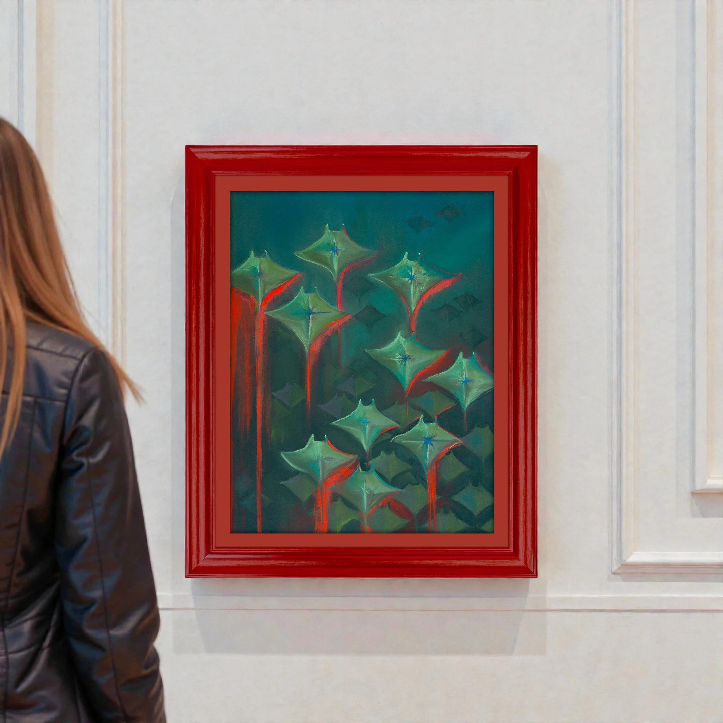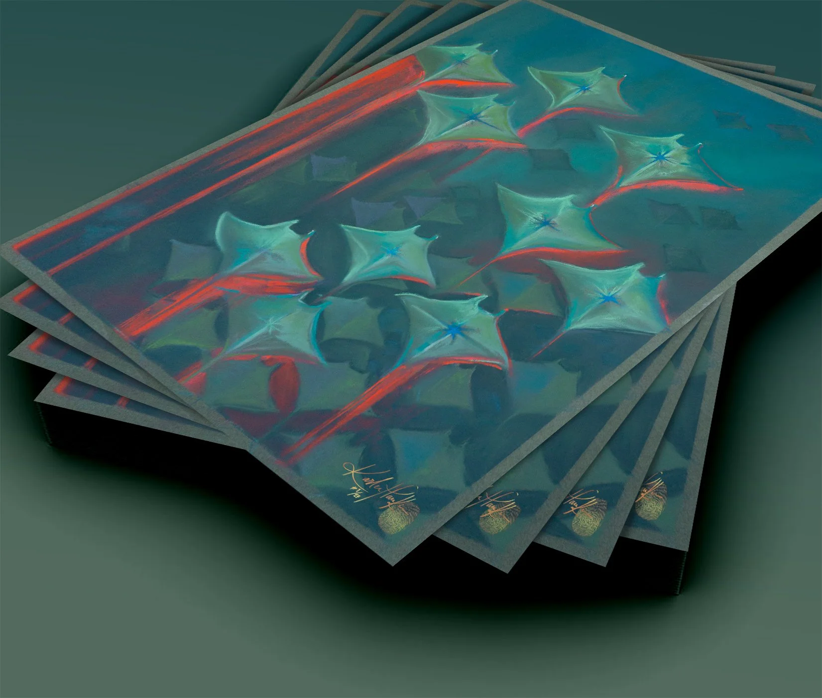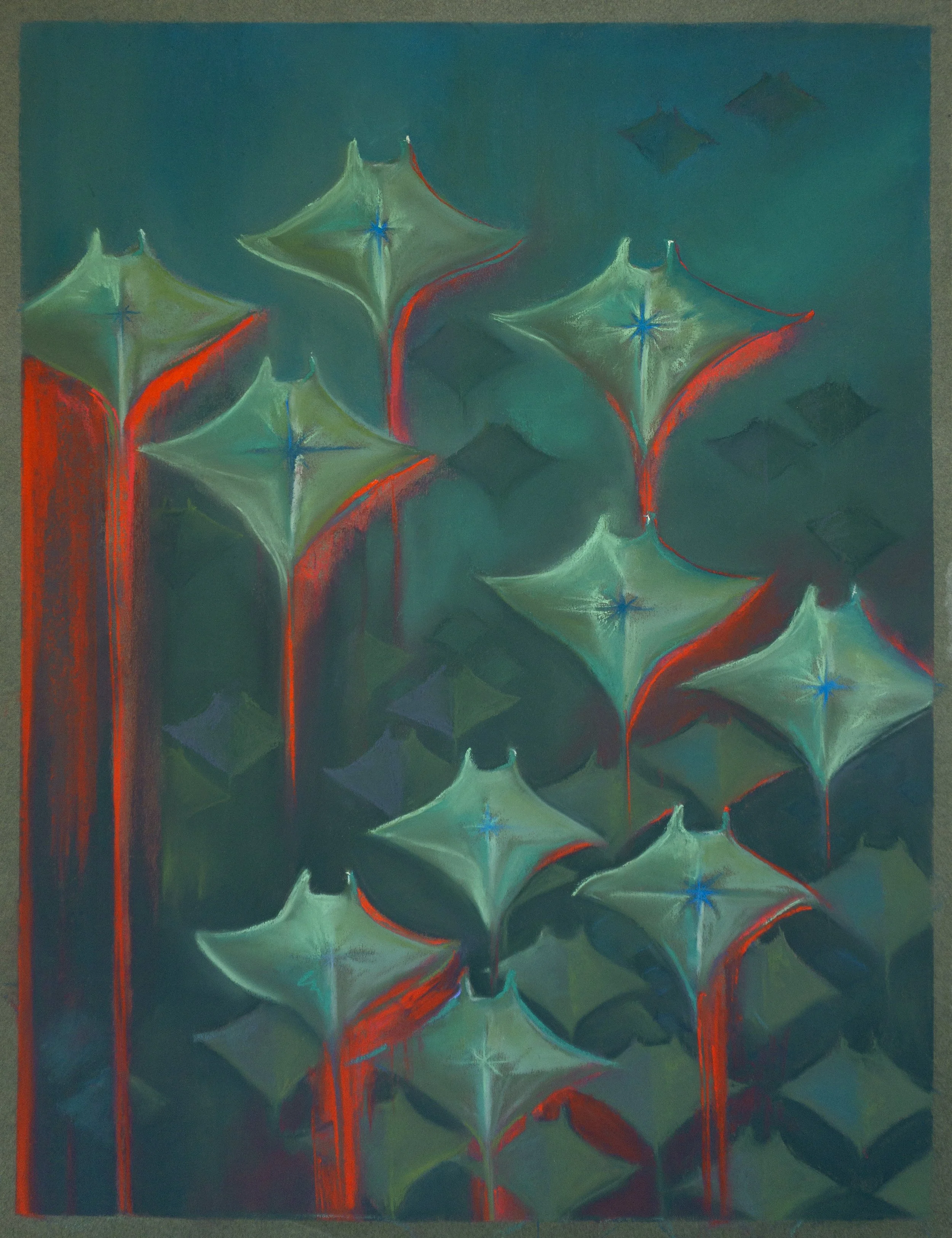 “No.4 Make a wish carries a high sense of grief, but within each of the rays is a token of hope that all of us carry. That potential is emerging, despite it all. Each of the rays carries a story of their own, amongst peers. They have potential in the form of a star - all expressing themselves very differently, in the same space. The reds scarring downward in the wake of the swim, delivers how each of them express, and how those expressions might affect others. I was thinking a great deal about those closest to us, and the repetition of family stories / cycles. The stage at which we deliver ourselves from them, essentially.
